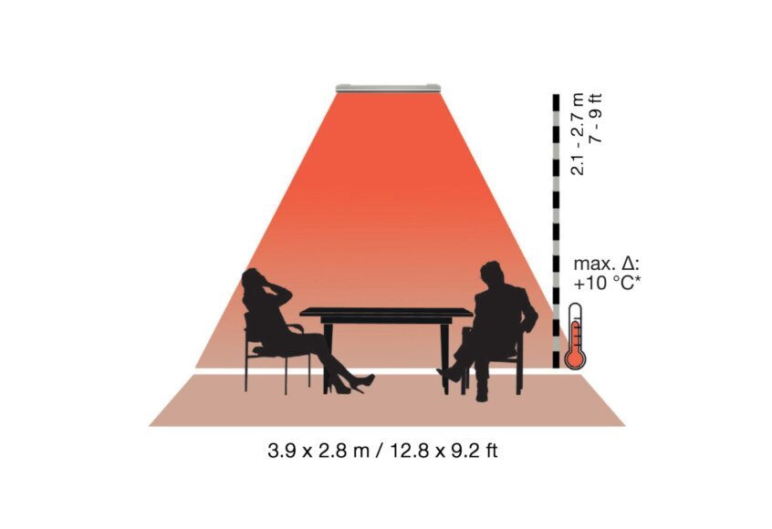 Up to 94% of the energy used is turned into ambient heat and transferred directly to nearby people and surfaces for maximum efficiency.